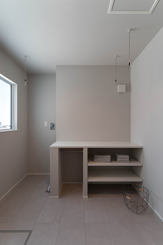 脱衣室兼ランドリールームは物干し金物の他、タオルなどを収納できる棚や作業台として使えるカウンターも備え、洗濯に関わる移動を最小限に抑えられる
