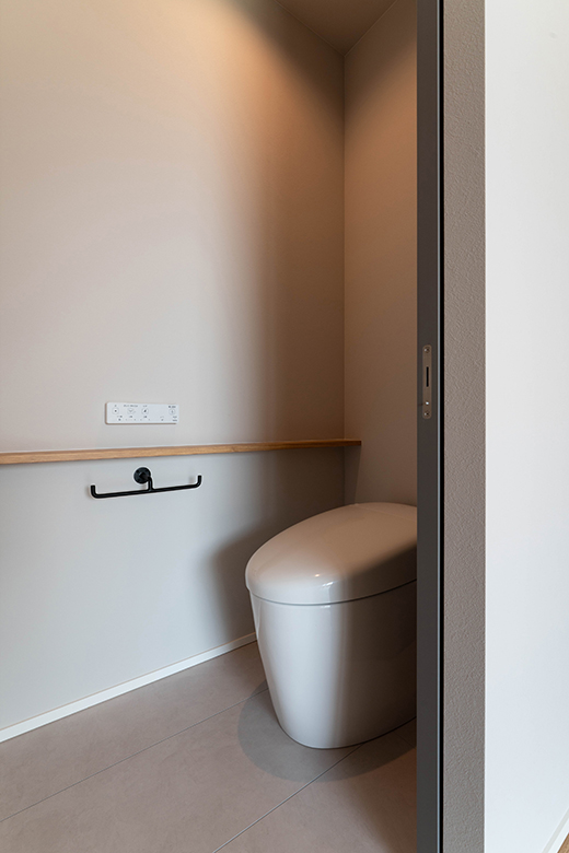 トイレには小物を置けるカウンターを設置。ペーパーホルダーは黒のアイアンを使い、シンプルでスタイリッシュ