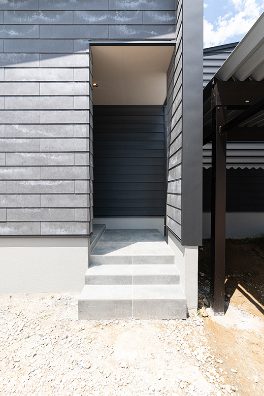 ブラックのガルバリウム鋼板をベースに、グレーの窯業系サイディングを使ってアクセントを利かせた外観