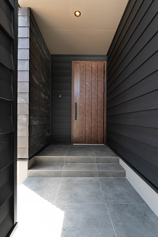外壁の配置の工夫で道路側から玄関の出入りを見えなくしたアプローチ