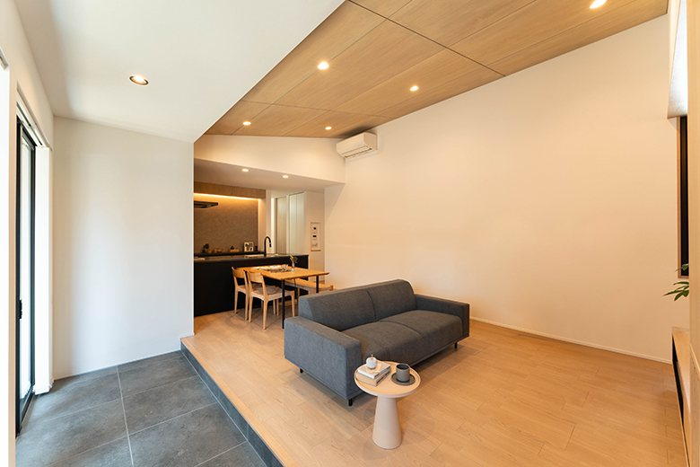 玄関ホールを省いた土間リビングは内と外をゆるやかにつなぐ。造作収納や間接照明が映えるデザイン壁が、暮らしの中心となる空間に落ち着きと温もりを与える