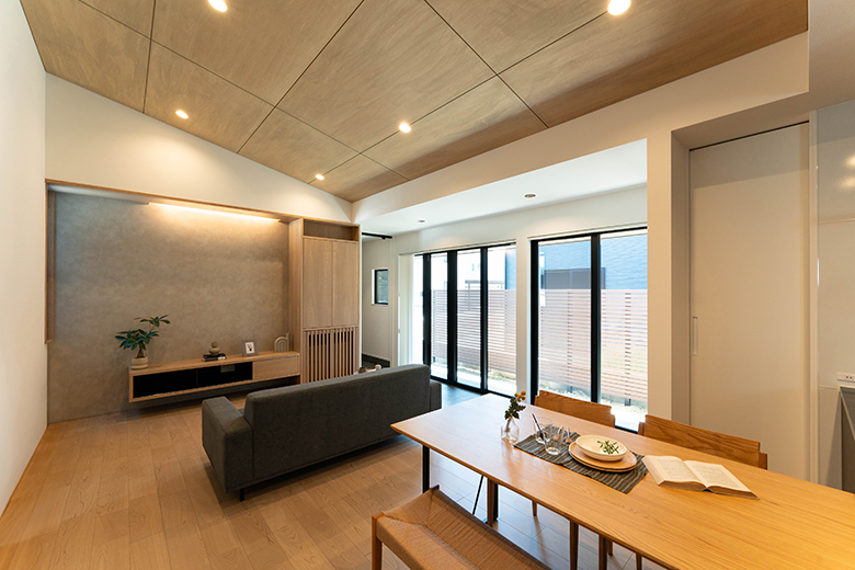 TVボードと一体になった造作の収納や勾配天井など、木のぬくもりをふんだんに感じられるLDK