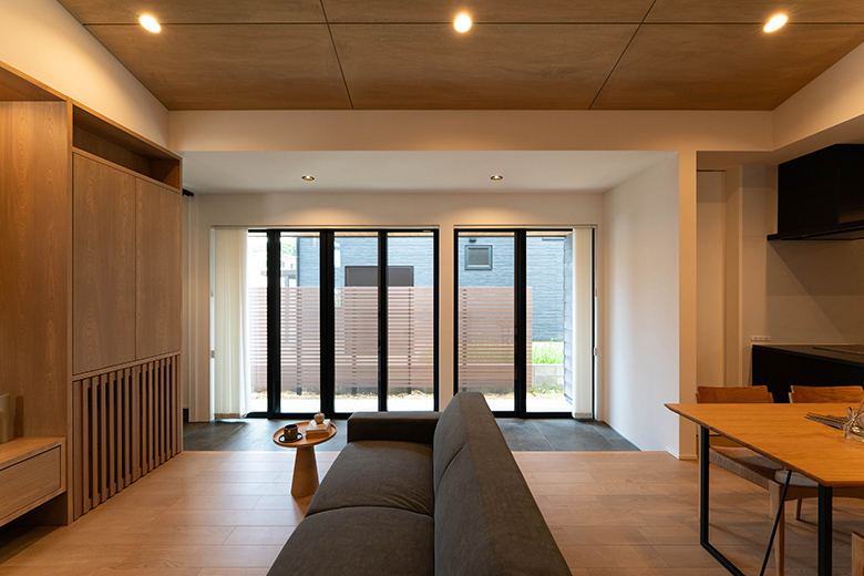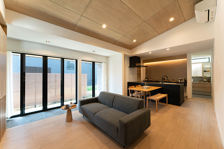 土間とフラットにつながるリビングは、外との距離をぐっと近づける心地よい設計。連続する大開口サッシと木天井が、空間に奥行きと広がりを生み出している