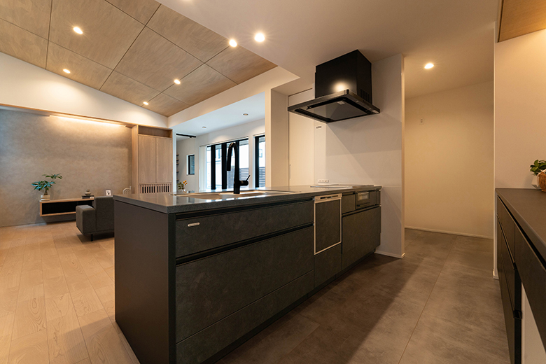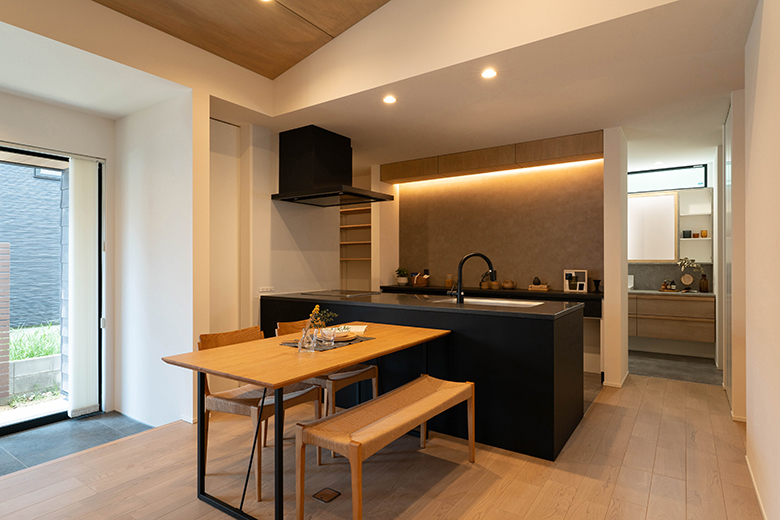 ブラックやアースカラーを配色したスタイリッシュなダイニングキッチン。背面に水回り動線を集約