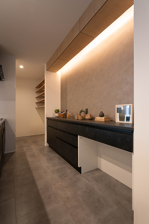 背面収納上部では木を使った下がり天井に間接照明を埋め込み、アースカラーのアクセントウォールを優しく照らす
