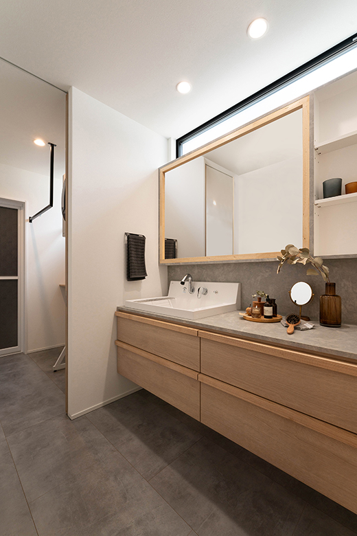 明るい木目を基調に、石目調の化粧板との組み合わせで個性を演出する洗面化粧台