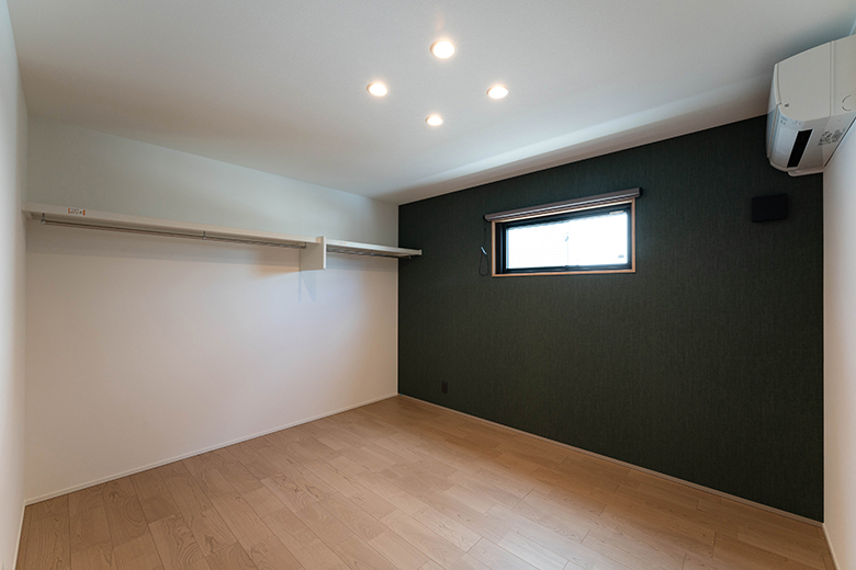 寝室は深緑のアクセントクロスで落ち着きがあり、クローゼットは扉のないオープンタイプで使いやすい