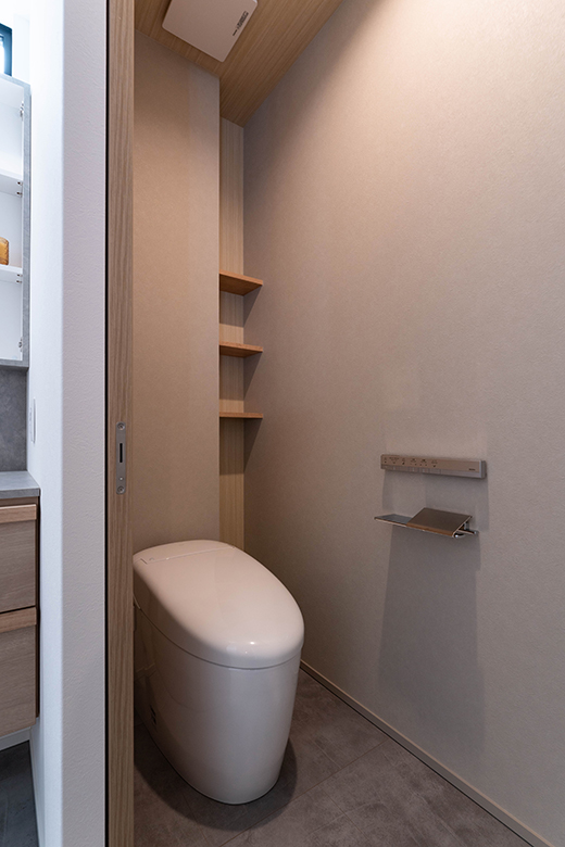 背面にふかし壁を作り、デザイン性の高い収納スペースを設けたトイレ