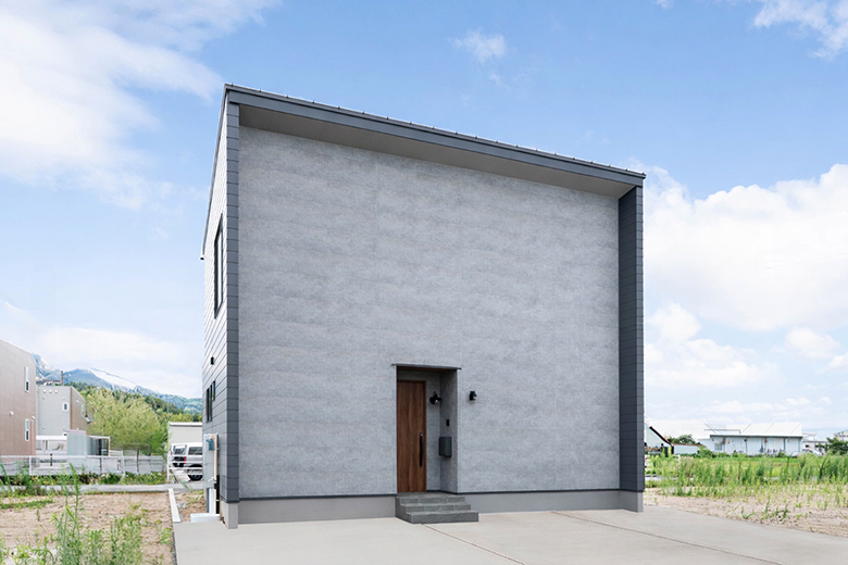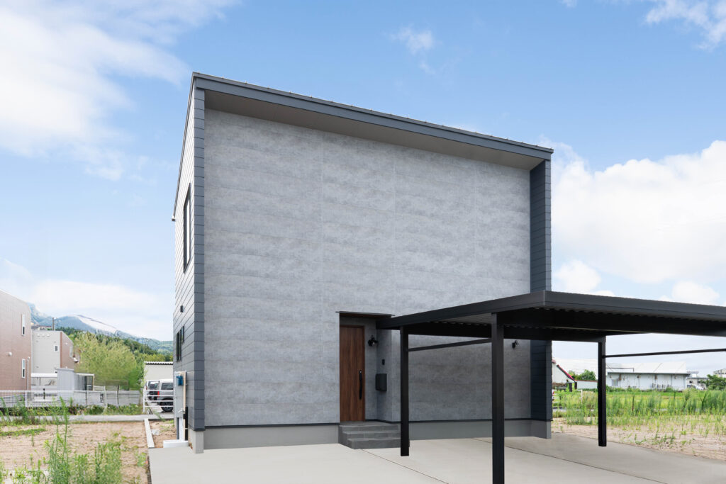 前面にコンクリート調の窯業系サイディングを使い、中央に玄関を配置したシンプルでモダンな外観