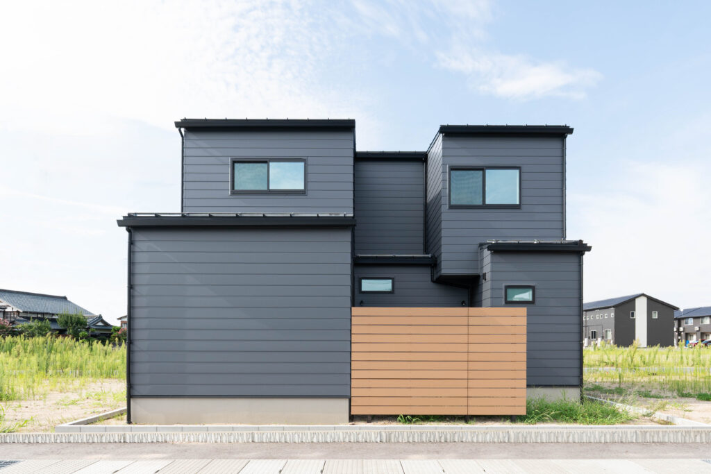 側面と裏側はダークグレーのガルバリウム鋼板が使われ、玄関側とは異なる表情を見せる