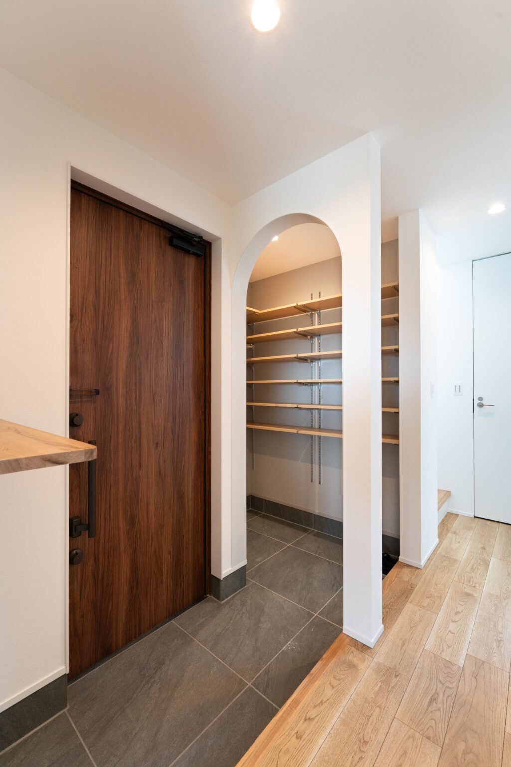 かわいい雰囲気のR開口の奥には大容量のシューズクローゼットを備える