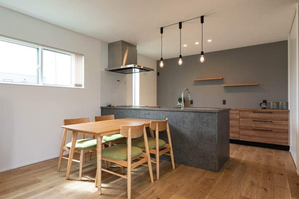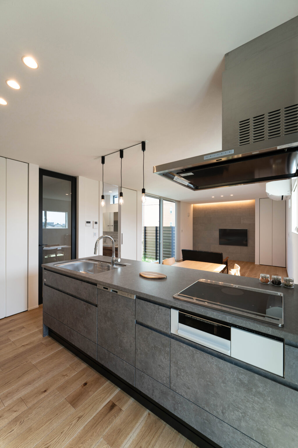ワークトップまでグレーで統一したキッチンはシックな印象を与え、周囲のリビングドアやペンダントライトの黒と共に空間を引き締める