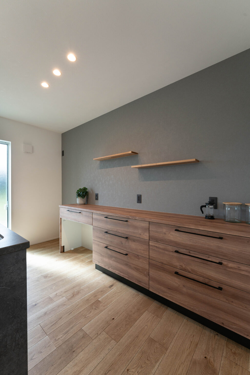 素材感を活かした木目の収納と、上質なグレーのアクセントウォールがシンプルで洗練された印象に。生活感を抑えながら、使い勝手にもこだわった