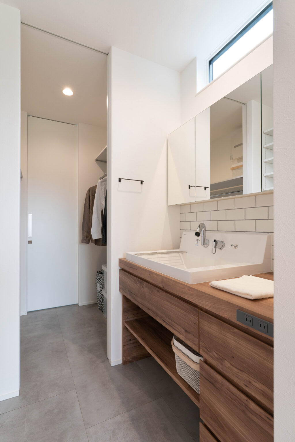 木の質感が際立つ造作洗面台に、タイルを合わせた上質な洗面空間。ファミリークローゼットを隣接させ、毎日の身支度などを効率的にこなせる
