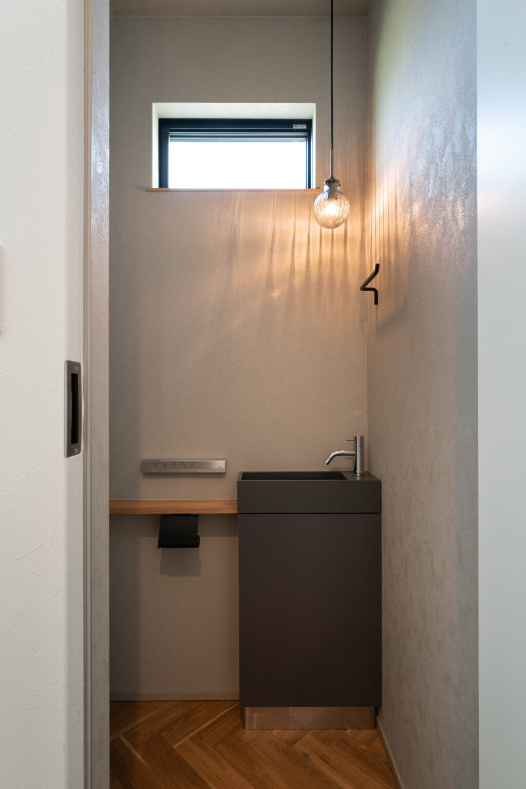 トイレもグレーを効果的に使い、シンプルモダンな空間に。電球色のペンダントライトが温かみをプラス