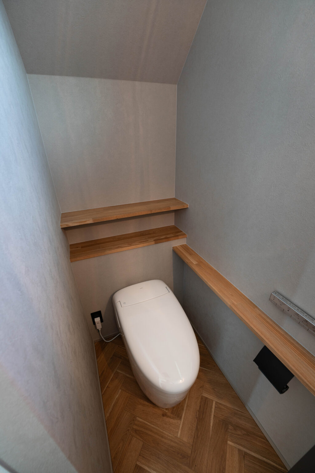 1階トイレは階段下の空間を無駄なく活用。ヘリンボーン柄のクッションフロアや黒いペーパーホルダーなど、随所にこだわりをちりばめた