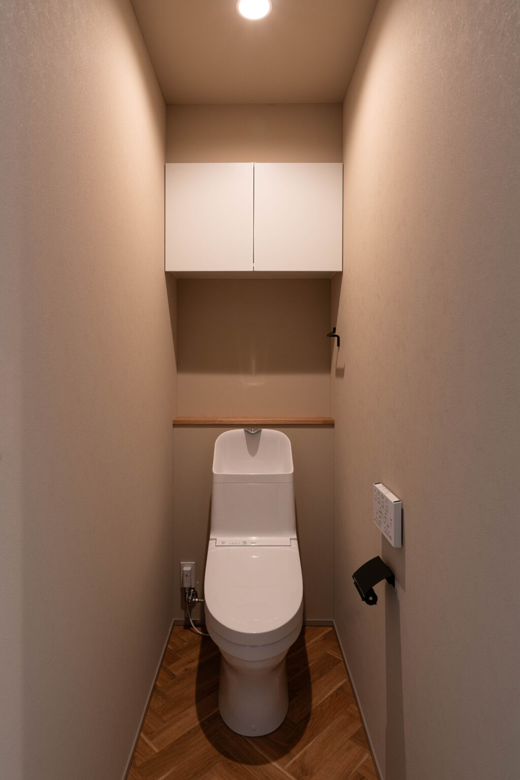 2階トイレは上部に収納を設け、手洗い付きの便器で省スペース