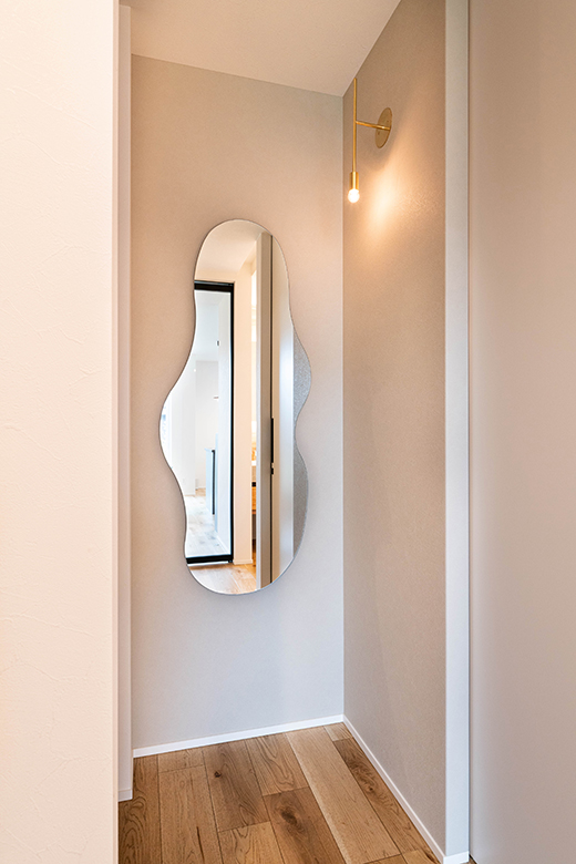 有機的なフォルムのミラーと柔らかな光が、シンプルな空間に個性と華やぎを添える玄関ホール