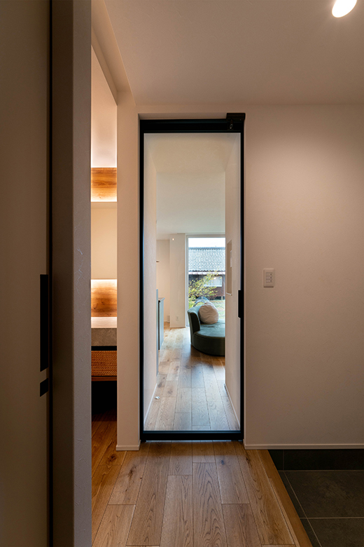 玄関からリビングまで視線が抜け、明るさと奥行きを感じられるアプローチ。外の景色も日常に取り込む設計