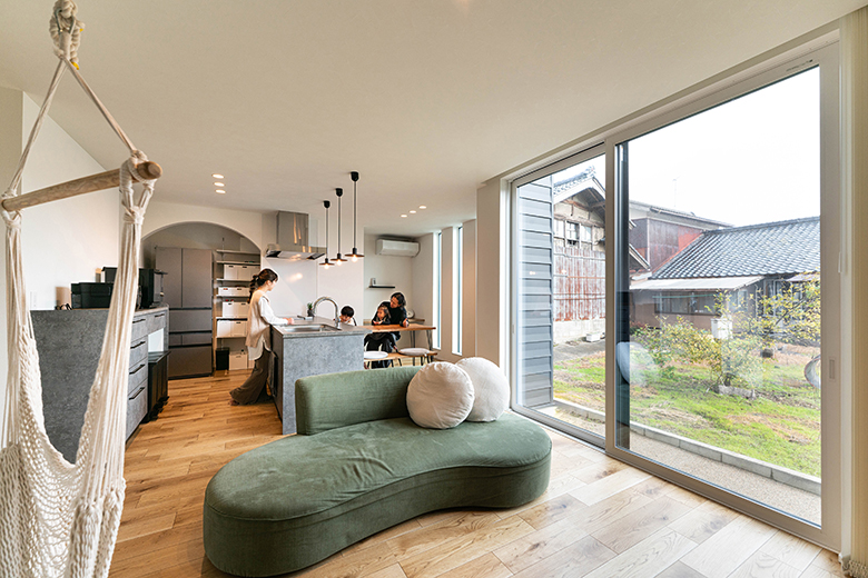 大きな窓から自然光があふれ、家族の笑顔を包み込むLDK。内と外のつながりが、暮らしに心地よさを広げる