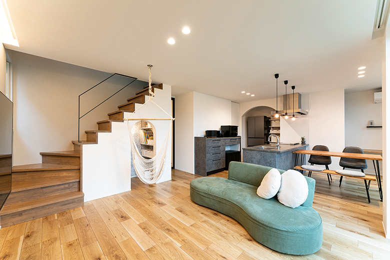 階段下を活かしたヌックスペースとハンモックが、家族の遊び心と暮らしのゆとりを感じさせるLDK