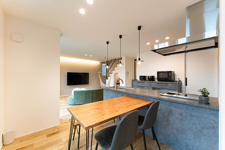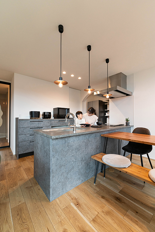 マットなグレーのキッチンに、存在感のあるペンダント照明が調和。素材感と灯りが空間に上質なアクセントを添える