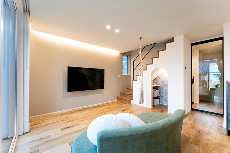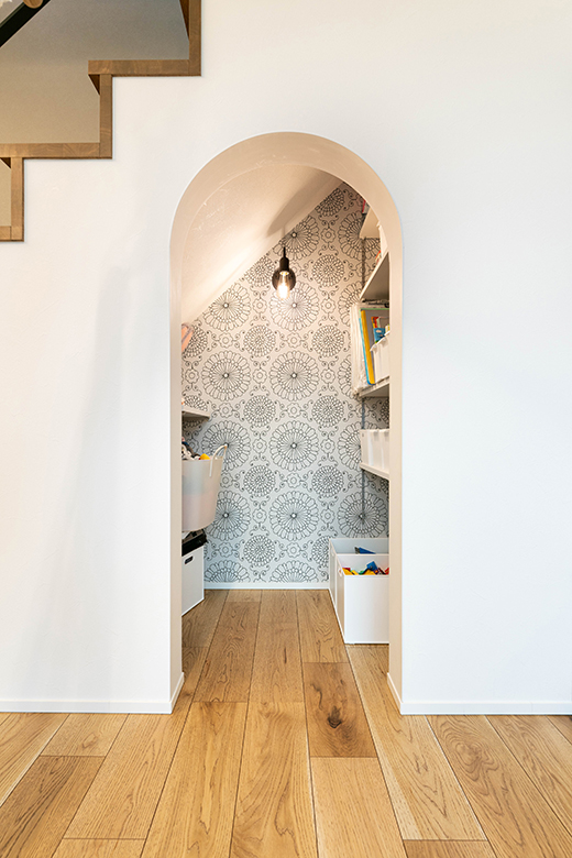 アーチ開口が印象的な階段下のキッズスペース。遊び心と収納力を両立した、子どもの秘密基地