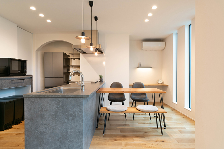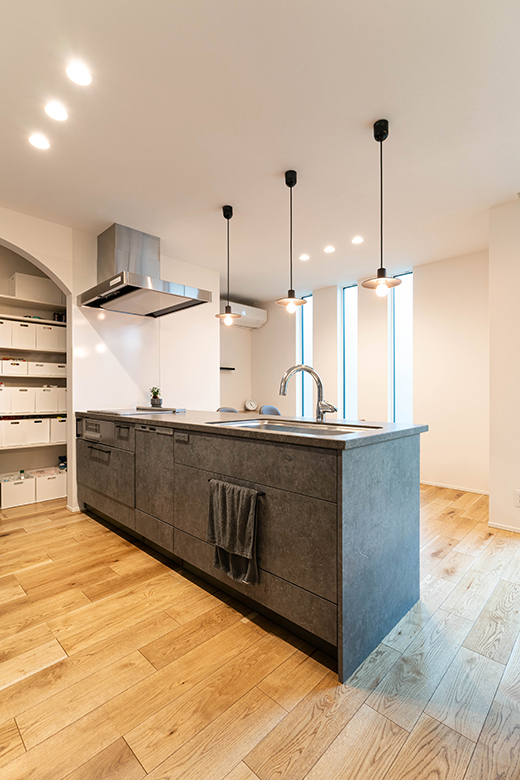 アーチ開口の奥まで続く収納動線と、一体感のあるダイニングキッチン。家事も団らんもスムーズに
