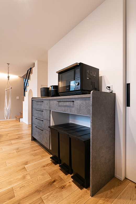 ゴミ箱をすっきりと隠せるカウンター収納。家電と並べても生活感を抑えた統一感あるキッチンに