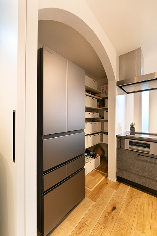 アーチ開口の奥に備えたパントリー。冷蔵庫まわりもすっきり収まり、出し入れしやすい家事動線に