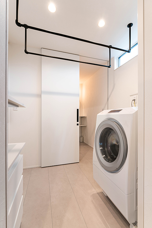 天井吊りのブラックバーがアクセントに。洗濯・干す・片付けが一室で完結するスマートランドリー