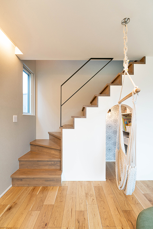 シンプルなスチール手すりが映える階段。下部にはアーチ開口の収納&キッズスペースを設け、遊び心もプラス