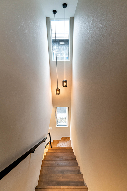 吹き抜けの階段に吊るされたペンダントライトが上下階をやさしくつなぎ、縦空間の開放感を引き立てる