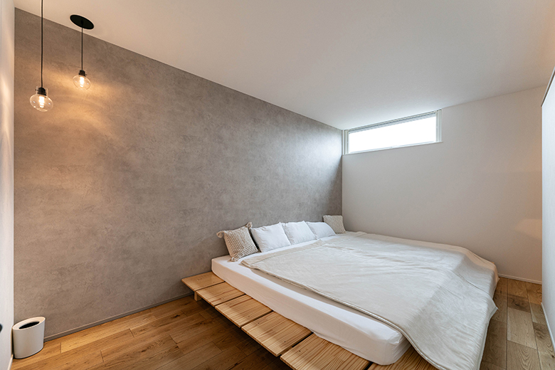 グレーのアクセントクロスが空間を落ち着いた雰囲気にまとめ、吊り下げ照明の柔らかな光が寝室に上質な陰影を添える