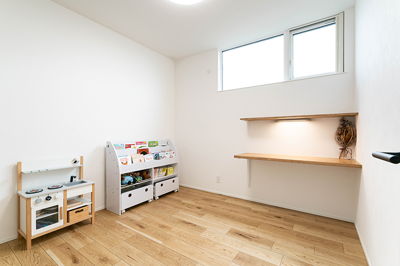 高窓から光が差し込むシンプルな子ども部屋。おもちゃ収納や造作カウンターで、遊びと学びの空間を両立