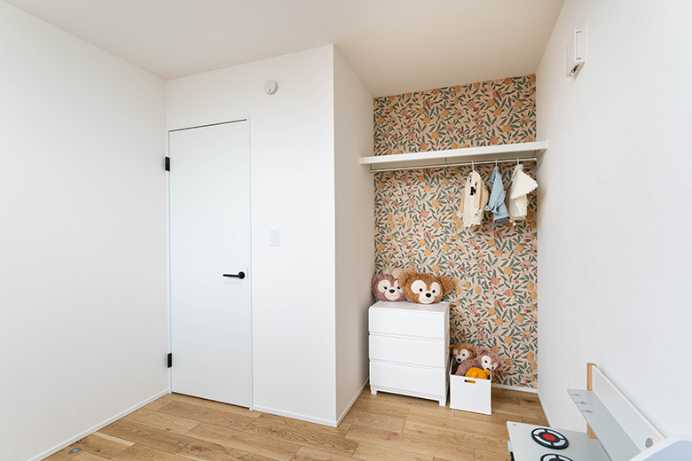 フルーツ柄のアクセントクロスが可愛らしい子ども部屋。オープンクローゼットで出し入れもスムーズに