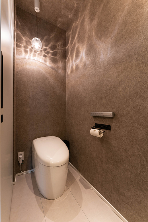 揺らめく光が壁に映るガラスペンダントが印象的。落ち着いたカラーのクロスと合わせて上質感のあるトイレ空間に