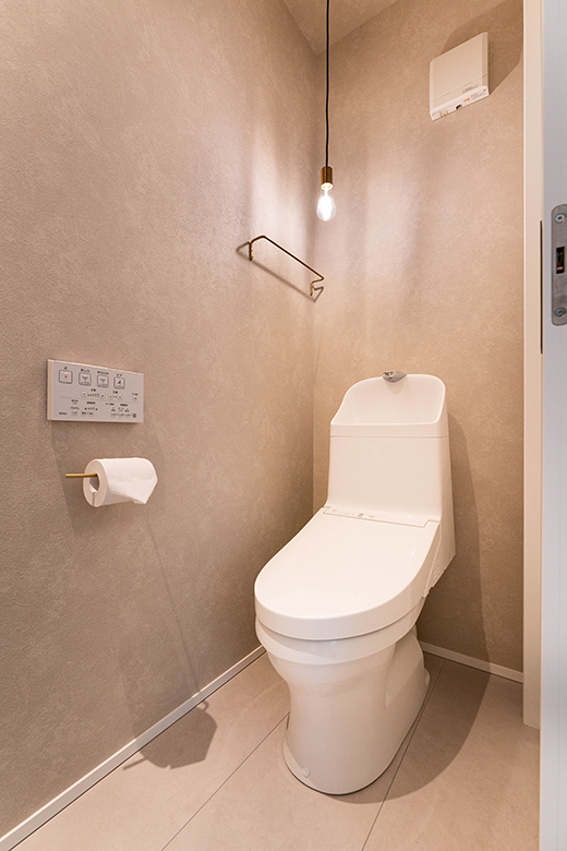 優しいトーンのグレージュクロスでまとめた空間に、真鍮のペンダント照明と小物がアクセント。シンプルながら上品さを感じるトイレに