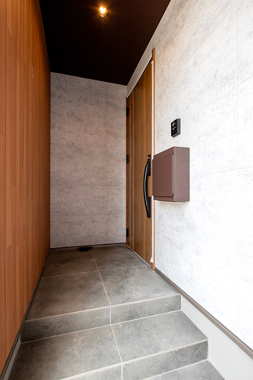 異素材の外壁デザインを楽しめる玄関ポーチは道路側から見えにくく、プライバシーを重視した設計