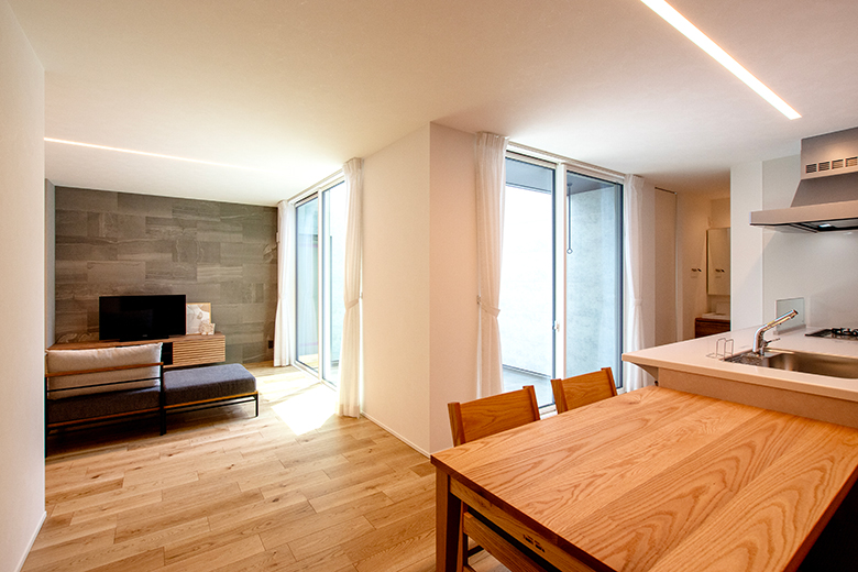 中庭へつながるL字型の開口で自然光を採り入れられるLDK。室内全体に柔らかな光が行き渡り、時間帯によって表情の変わる心地よい空間に