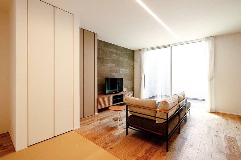 リビングには造作のTVボード。エコカラットのアクセントウォールが空間を引き締める