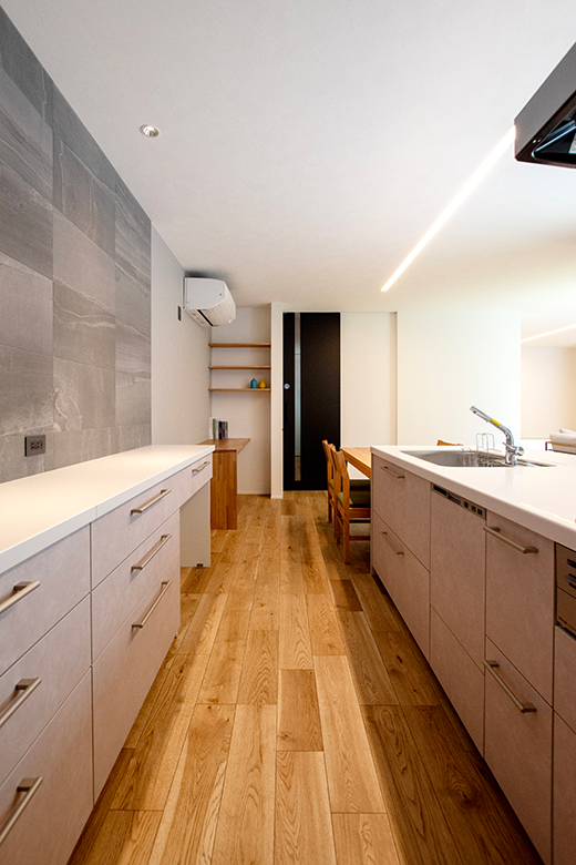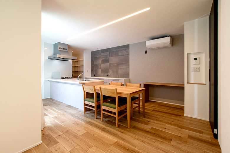 ダイニングキッチンの背面もエコカラットとグレーの壁紙でリビングと調和。素材と色をそろえることで、空間全体が一体となり、落ち着きと上質さを感じられる仕上がりに