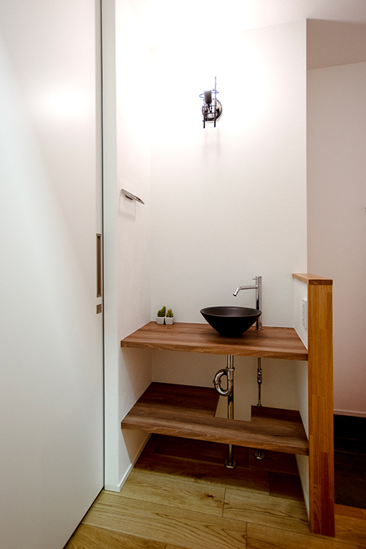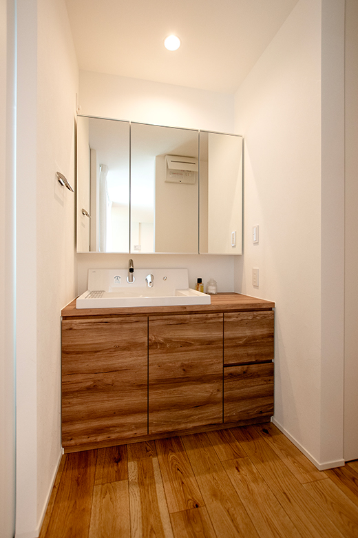 木目調で落ち着いた印象の洗面化粧台。脱衣室と分け、LDKから直結しているので来客時の使い勝手も良い