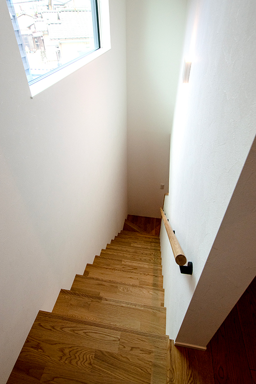 玄関ホールからつながる階段。暗くなりがちな部分を2階のFIX窓で解決