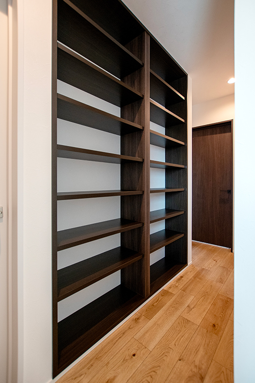 2階ホールの壁面を使って書棚を設置。階段を上がってすぐの場所にあるので家族みんなで沢山の本を共有できる