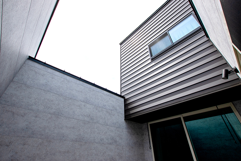 ガルバリウム鋼板をベースに、下屋部分に木目とコンクリートの異なる風合いでアクセントを効かせた外観。素材のコントラストが奥行きを生み、表情豊かなデザインが住まいの個性を引き立てる