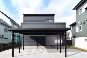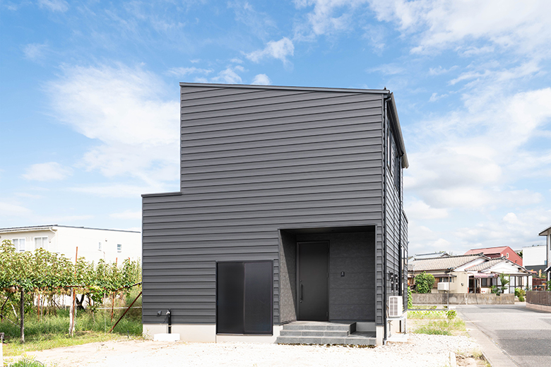 横張りの黒いガルバリウム鋼板を使った外壁に、玄関や外部収納の扉も黒で揃えてシックでシンプルな外観
