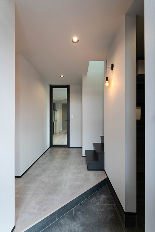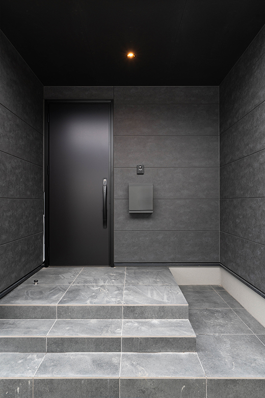 玄関周りには窯業系サイディングを施し、同じブラック系でもドアやポストなどと微妙に異なる色味でアクセントをつけた