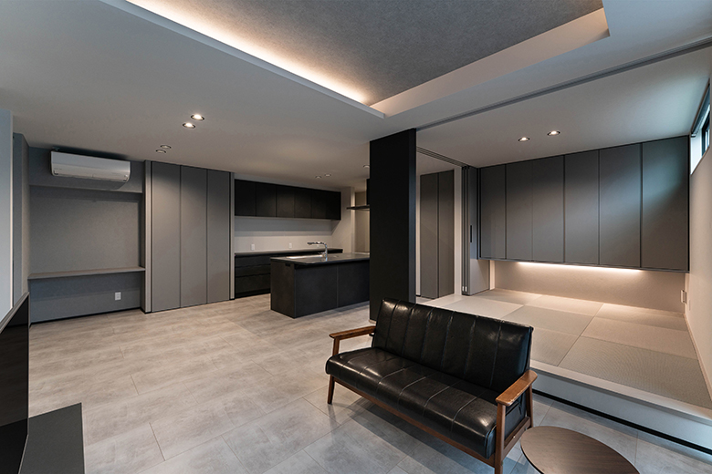 グレーを基調とした落ち着きあるLDK。段上がりのタタミスペースや間接照明が奥行きを生み、静かに暮らしを彩る大人のモダン空間
