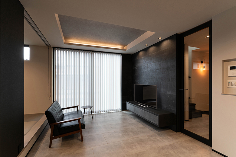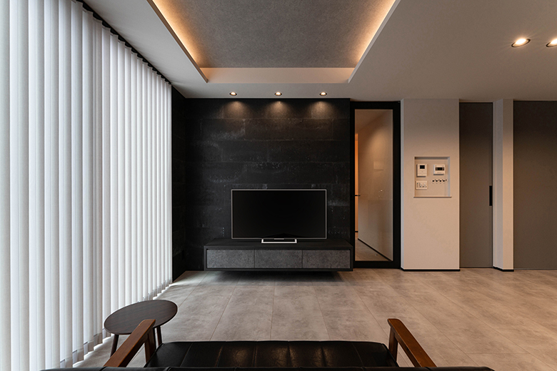 リビングではグレーを基調とした造作のTVボードと背面にブラックのSOLIDOを貼ったアクセントウォールが存在感を放つ